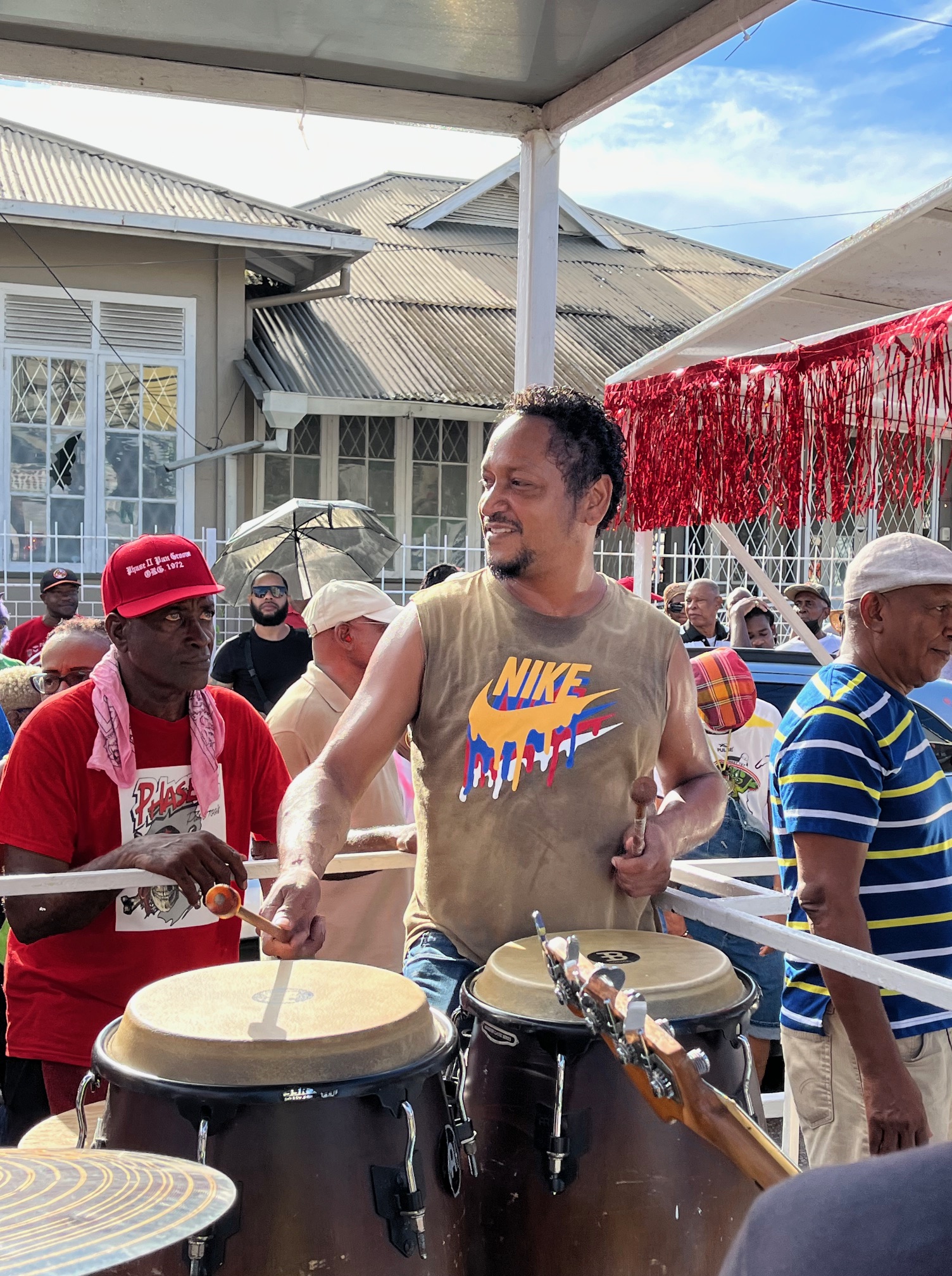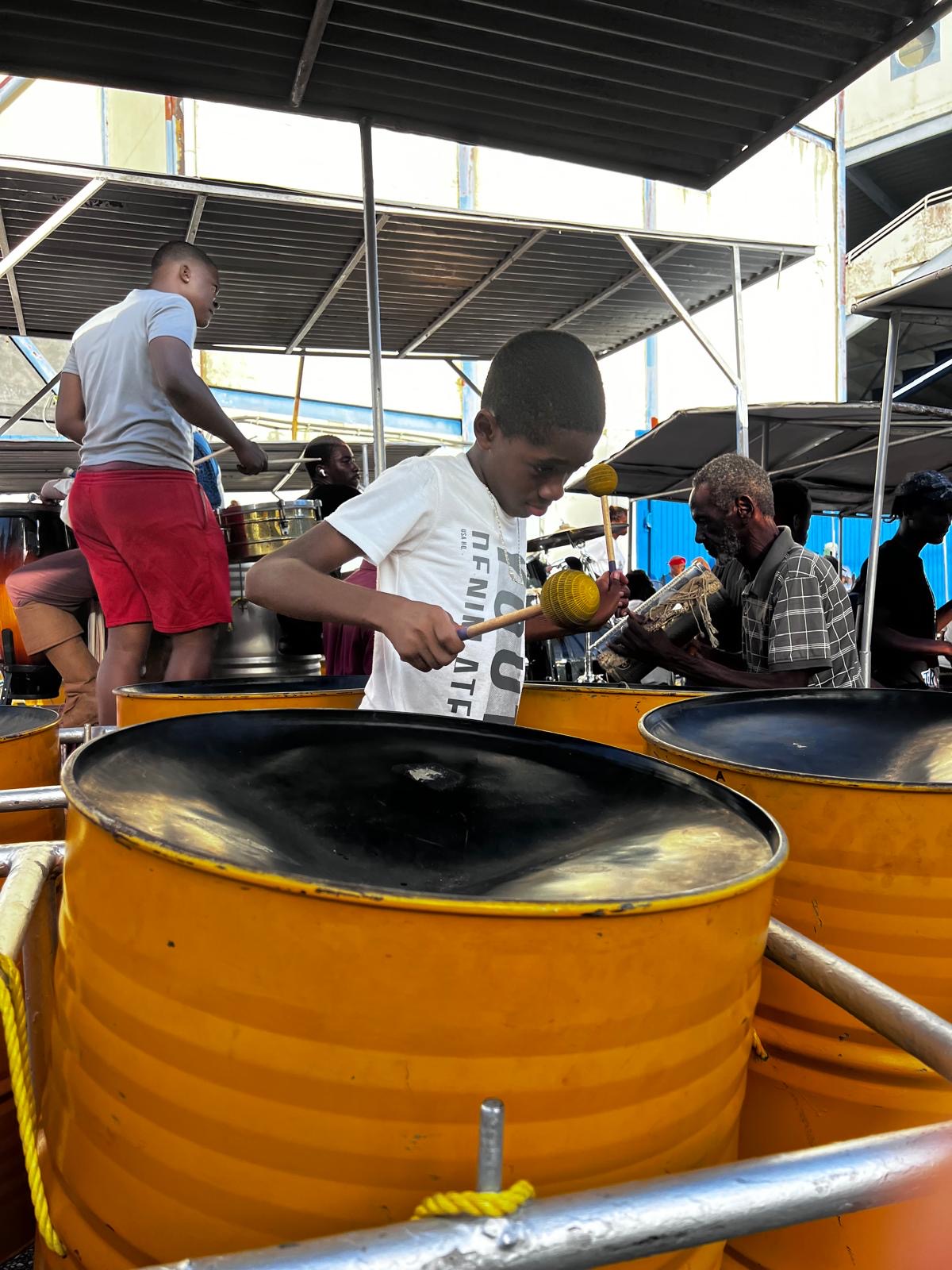 We walk down a street with throngs of revelers each with a beverage in their hand. It’s not coffee that is apparent from their excited faces, although 5:30 seems a bit too early in the day. We can hear the band approaching down the street, the sharp and distinct sounds of the steel pans rising as they get closer