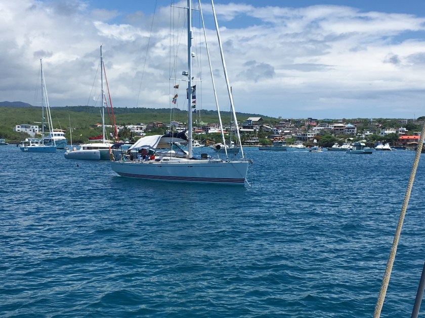 You can’t just sail into San Cristobal. There’s rules and regulations and plenty of them. We were briefed extensively at Las Perlas on the boat inspection, rules on garbage sorting and collection, regulations on what food items are not allowed (eggs, vegetables, fruits, milk, and just about anything you can think of). There is a quarantine process, and you cannot leave the boat until everything has been thoroughly inspected and given a clean bill of health. There is a quarantine flag that you have to fly until you have been inspected and cleared. If there is any undesirable stuff on the hull, the boat has to be taken 45 nautical miles out to be cleaned and then return for re-inspection. So we were sailing in with our fingers crossed, our garbage sorted, our produce consumed or discarded, and a whole pumpkin hidden under the stairs in plain sight.