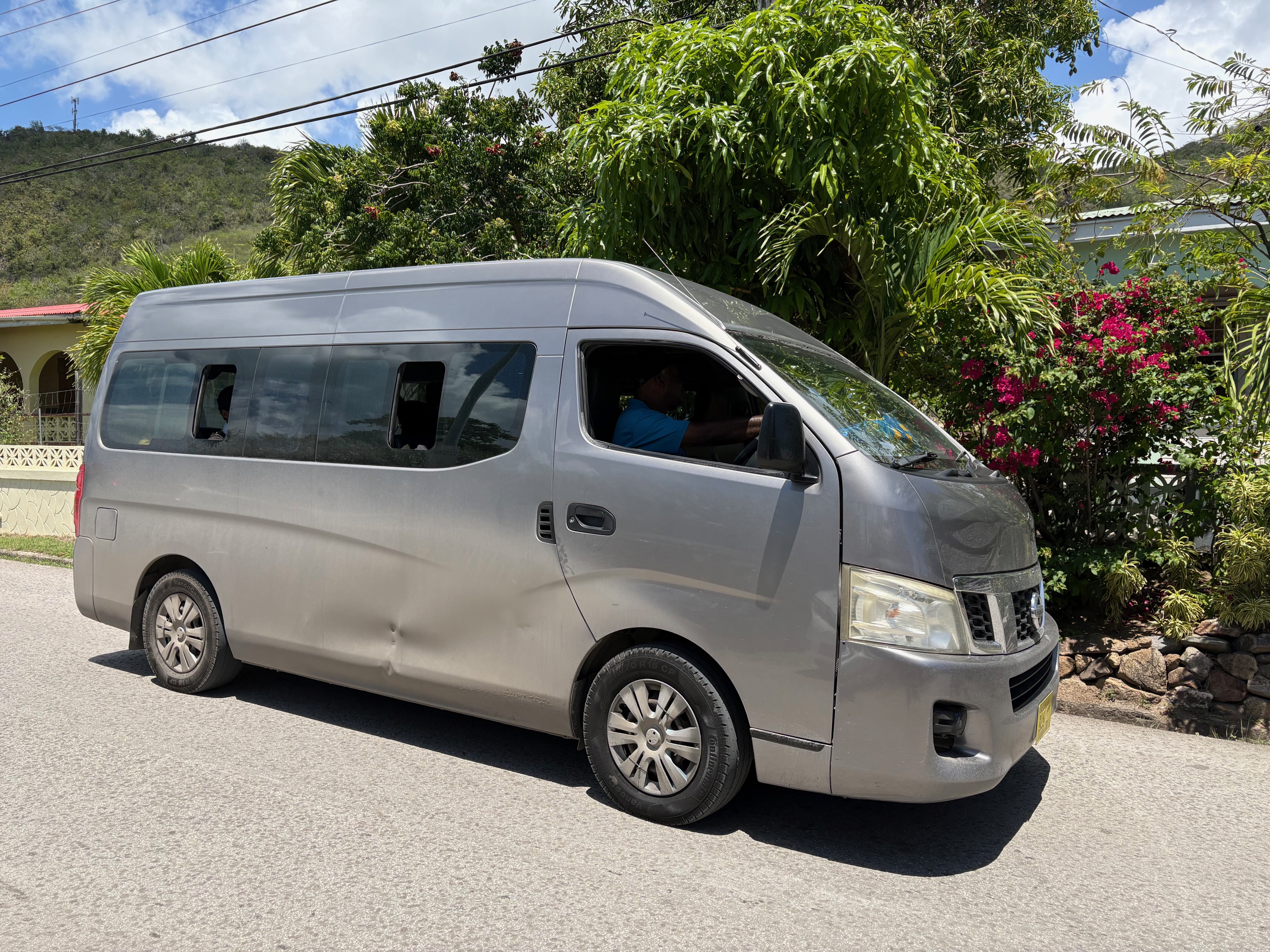 It was warm in the bus, but a nice breeze from the open windows kept things comfortable. Looking out, I could see people going about their lives, chickens and goats running freely, well tended island homes, and some run down ones, glimpses of the ocean, rolling hills, mango trees heavily laden with green mangoes -all adding to the island landscape.