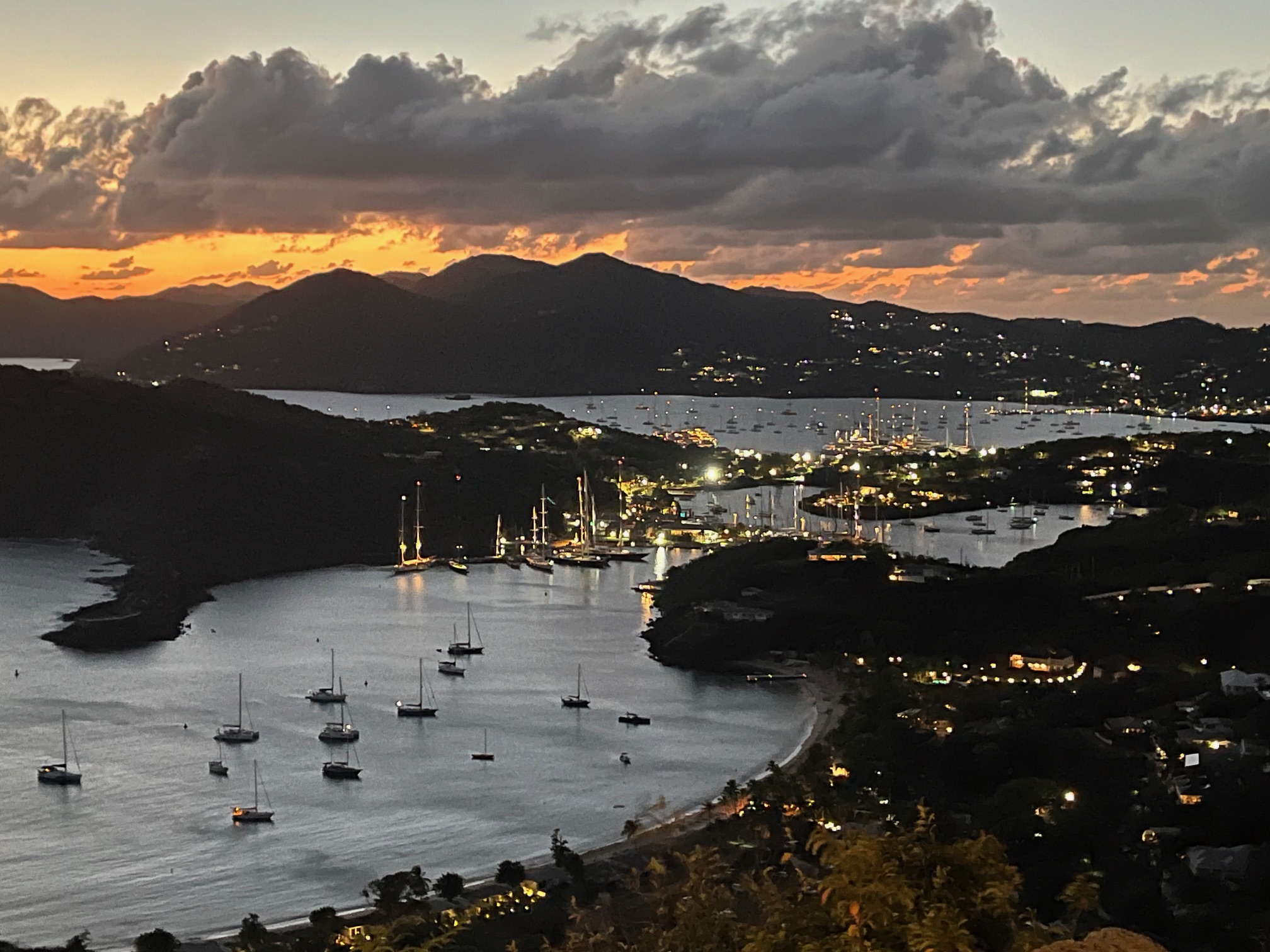 View of English harbor from Shirley Heights at sunset.
